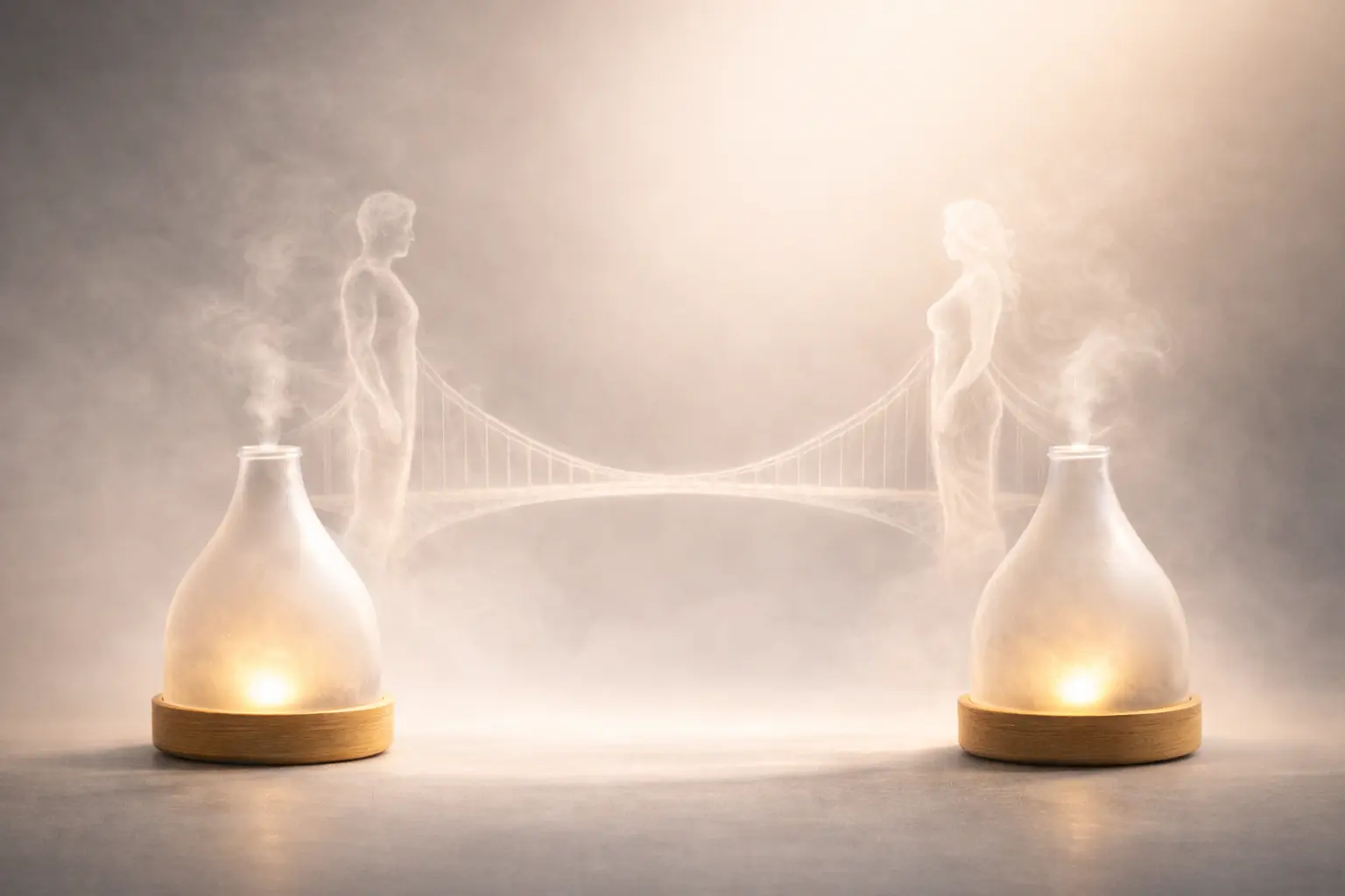 She handed him a tall glass diffuser with an olive wood base, its neck elegantly curved like a question mark frozen mid-air. "Ilias," she named it. "Cold nebulization only. The apparatus' mechanics fracture the oils into micro-droplets - no heat, no degradation. The molecules speak their truth."